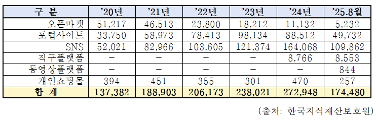 온라인 모니터링 적발 건수는 2020년 13만7천 건 수준에서 2024년 27만2천 건으로 2배 이상 증가했으며, 올해(2025년) 8월까지는 이미 17만4천 건이 적발됐다.