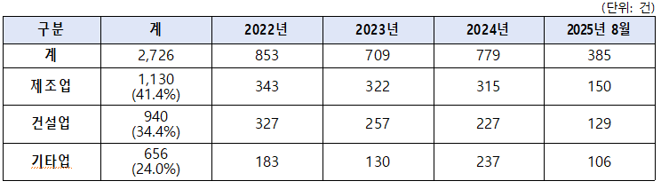 한편, 적발 사업장에는 시공능력평가 상위 10대 건설사도 포함됐다. △DL이앤씨(2025년 1건) △GS건설(2025년 1건) △에스케이코플랜트(2024년 1건) △롯데건설 (22년 1건)이 대표적이다.