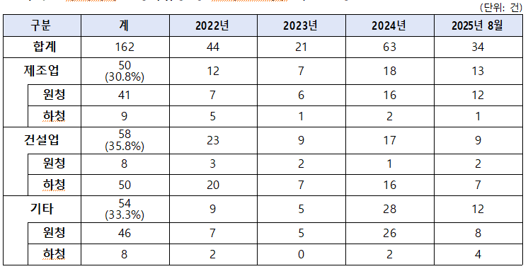 문제는 중대재해가 발생한 사업장의 산재 보고의무 위반건수가 2022년 44건에서 2024년 63건으로 1.4배 증가했다는 점이다. 특히 같은 기간 동안 가장 많이 적발된 건설업(58건)의 경우, 위반 대부분이 하청(50건, 86.2%)에서 발생한 것으로 나타났다.