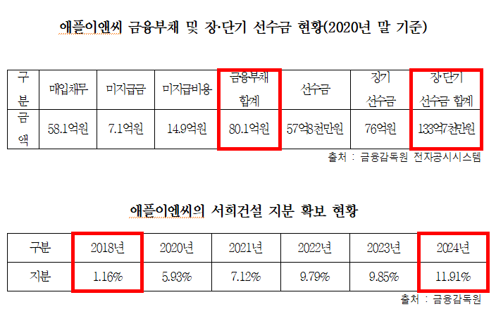 뿐만 아니라 애플이엔씨의 특수관계인 간 자금 지원 정황도 확인됐다. 2020년 말 기준 애플이엔씨의 부채 항목 중 ▲매입채무 58.1억 ▲미지급비용 14.9억 ▲선수금 57.8억 ▲장기선수금 76억 등 거래처로부터 조기에 대금을 지급받는 방식의 자금 지원이 포착됐다.