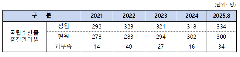 전 의원은 “수산물 방역, 수출검사, 품질인증, 친환경 인증, 이력관리 등 핵심 업무를 수행하는 기관임에도 정원을 채우지 못하고 있다”며 “2023년에는 27명, 2024년에는 16명이 부족했고, 올해 8월 기준으로는 34명이 결원 상태로 인력난이 오히려 악화되고 있다”고 우려했다.