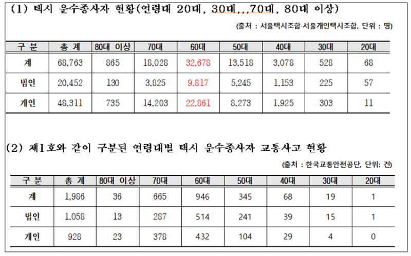 특히 개인택시 부문에서는 70대 기사들의 사고가 378건, 80대 이상도 23건 발생해 고령 운전자의 안전 문제가 뚜렷하게 드러났다.