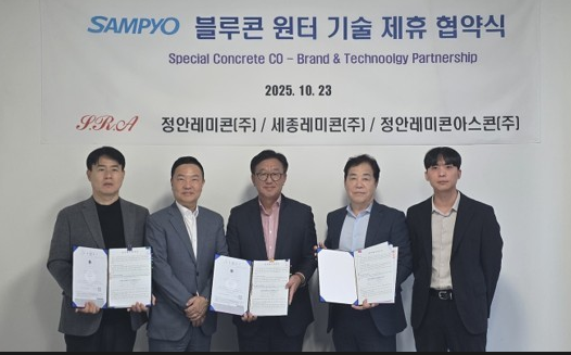 삼표그룹(회장 정도원)의 주력 계열사인 삼표산업은 정안레미콘, 세종레미콘, 정안레미콘아스콘과 지난달 23일 특수 콘크리트 브랜드 ‘블루콘 윈터’ 기술제휴 협약을 체결했다고 5일 밝혔다.