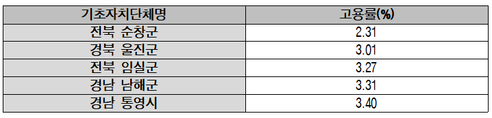 공무직 등 비공무원 근로자의 고용률은 상대적으로 높았다. 226개 기초지방자치단체 중 의무고용률을 채우지 못한 곳은 △전북 순창군, △경북 울진군, △전북 임실군, △경남 남해군, △통영시로 5곳에 불과했다. 반면 △부산 영도구, △경기 연천군, △광주 남구는 40%를 넘겼다.