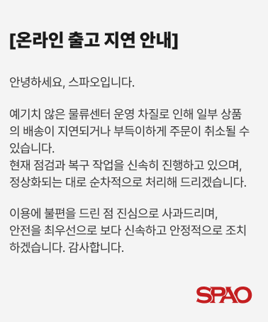 스파오와 뉴발란스는 홈페이지를 통해 “예기치 않은 물류센터 운영 차질로 인해 일부 상품의 배송이 지연되거나 부득이하게 주문이 취소될 수 있다”고 안내했다.