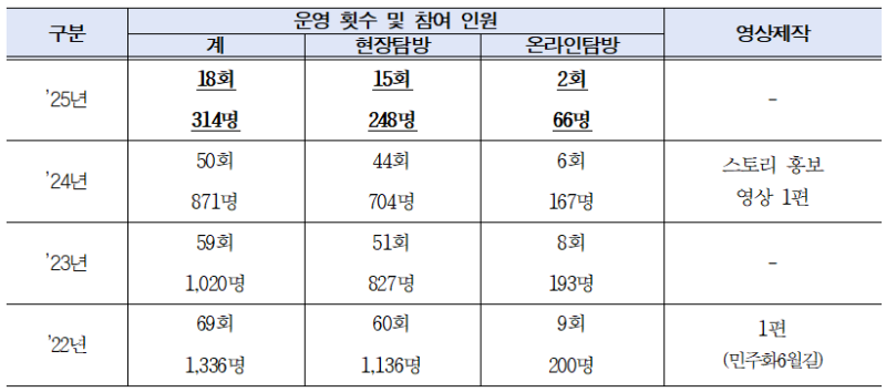 위원회가 제출한 자료에 따르면 2022년부터 위원회가 주관하는 인권현장탐방 프로그램은 운영 횟수 및 참여 인원이 지속적으로 감소했으며, 2025년 자료 제출 기준으로 참여 인원은 314명으로 전년도 871명 대비 36%이고 운영 횟수도 50회에서 18회로 줄었다.