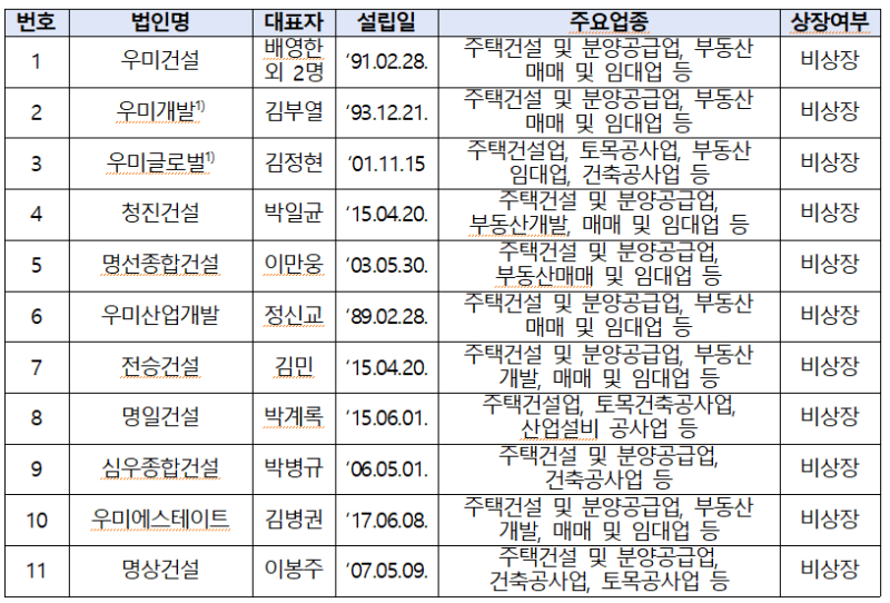 기업집단 「우미」는 2010년대부터 공공택지 입찰에 다수의 계열사들을 동원하는 소위 ‘벌떼입찰’에 적극 참여하였다. 그러던 중, ‘벌떼입찰’에 대한 사회적 비판이 거세지고, 실제 사업능력 없는 업체가 공공택지에 당첨되는 사례들이 많아지면서, 2016년 8월 한국토지주택공사(LH)는 공공택지 1순위 입찰 요건을 강화 하여, 주택건설실적 300세대를 갖춘 업체만 1순위로 입찰할 수 있도록 관련제도를 개선하였다.