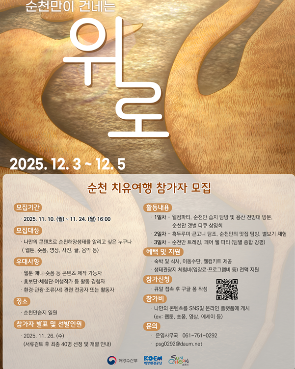 순천만 갯벌의 생태 자원을 기반으로 해양생태관광 활성화를 위해 진행되는 이번 프로그램은 국민 누구나 참여할 수 있으며 11월 24일까지 접수를 통해 최종 40명의 참가자를 선정한다.