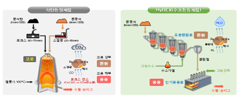 이러한 상황에서 포스코는 수소환원제철 기반시설 구축을 추진하고 있으며, 현대제철은 전통 고로가 아닌 전기로 중심으로 철강제품을 생산해 온실가스 감축을 시도하고 있다.