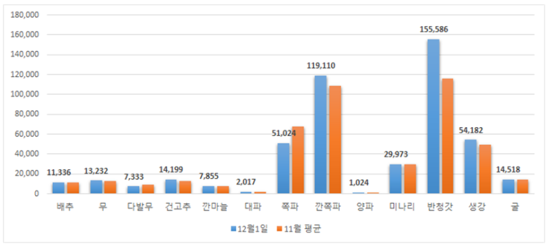 배추 상품 기준 12월 1일 평균가는 11,330원, 무는 13,230원으로 전월 대비 보합세를 보였다. 반면, 대파, 쪽파 등 채소류는 본격적인 수도권 김장 성수기에 접어들며 수요 증가로 소폭 가격 상승세에 있으며 부재료인 고춧가루, 새우젓, 멸치액젓, 천일염은 보합세에 있다.