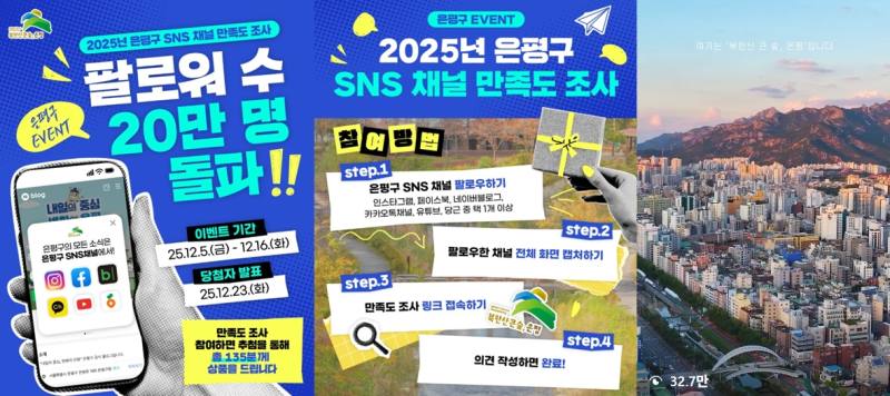 서울 은평구(구청장 김미경)는 구 공식 사회관계망서비스(SNS) 누적 팔로워가 20만 명을 돌파함에 따라, 주민 소통 강화를 위해 개설 이후 처음으로 만족도 조사를 시행한다고 밝혔다.
