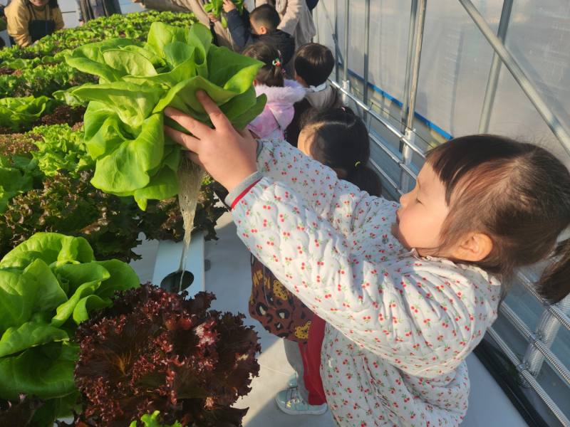 16일 경남 함안군 농촌진흥청 국립원예특작과학원 시설원예연구소 시험온실에서 인근 어린이집 어린이들이 순수 수경재배로 키운 상추를 수확하고 있다.<사진=농촌진흥청>