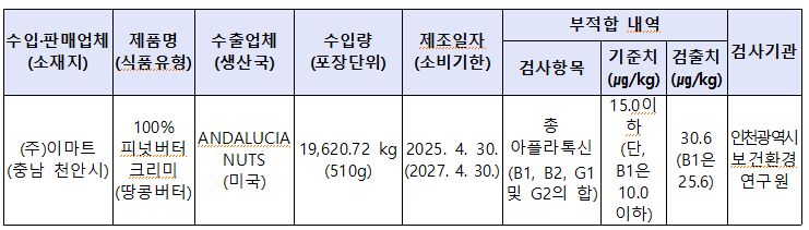 식품의약품안전처(처장 오유경)는 수입식품등 수입·판매업체인 ‘(주)이마트(충남 천안시 소재)’가 수입해 판매한 미국산 ‘100% 피넛버터 크리미(식품유형 : 땅콩버터)’에서 아플라톡신( 덥고 습도가 높은 지역에서 곡류, 견과류 등에 잘 생성되는 곰팡이독소 )이 기준치보다 초과 검출되어 해당 제품을 판매 중단하고 회수 조치한다고 밝혔다.