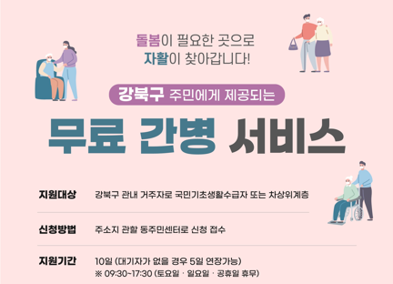 지원 대상은 강북구에 거주하는 국민기초생활수급자와 차상위계층이다. 대상자는 신체활동 보조를 비롯해 위생·청결 관리, 복약 지원 등 회복에 필요한 간병 서비스를 무료로 제공받을 수 있다. 식사 보조, 체위 변경, 신체기능 유지·증진 활동도 포함된다. 서비스는 1인당 최대 10일간 지원되며, 운영 시간은 평일 오전 9시 30분부터 오후 5시 30분까지다.