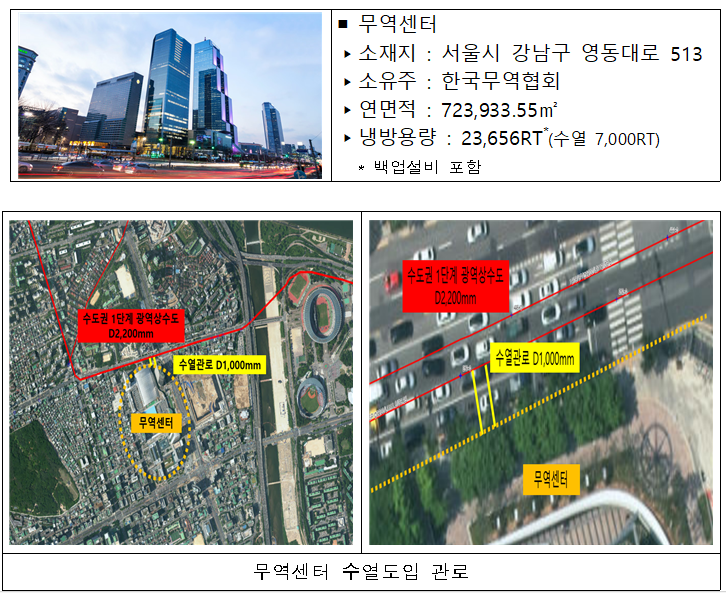 한국무역센터에 도입되는 수열에너지는 단일건물 기준 최대 규모인 7,000RT (Ton of Refrigeration으로 0℃의 물 1톤을 24시간 동안 0℃의 얼음으로 만드는 데 필요한 에너지의 양(냉난방 용량)으로, 1RT는 약 3.5㎾임 )용할 수 있는 전력량(8평 규모 면적 24시간 냉방 기준 1일 8시간, 1가구당 400kw/월 사용 기준 )에 달한다.