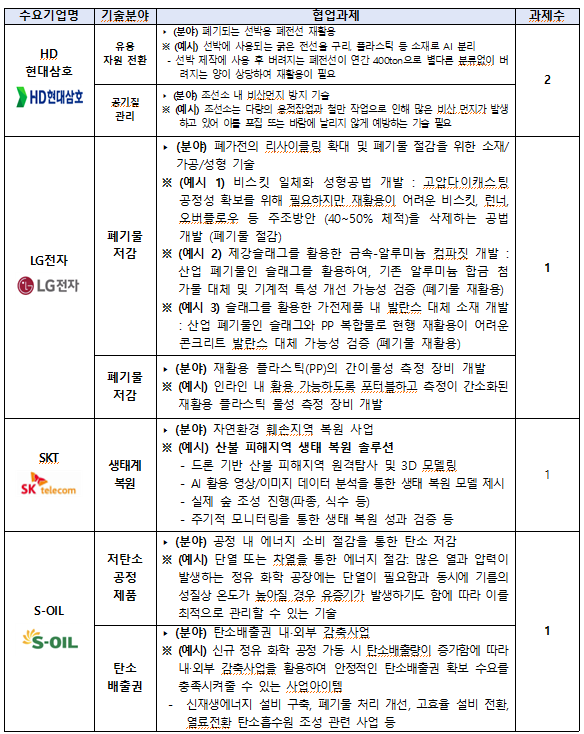 모집대상은 수요기업·기관에서 제안한 과제 (HD현대삼호(폐전선 재활용, 조선소 비산먼지 관리), LG전자(폐가전 리사이클링, 재활용 플라스틱 간이물성 측정), SKT(자연환경 복원), S-OIL(에너지 절감 기술, 탄소배출권 감축사업), 한국오라클(인공지능 기반 대기·수질 모니터링 및 에너지 효율개선), 한국전력공사(유기성폐기물 활용기술, 풍력발전량 예측), 호반그룹(지능형 물관리 시스템, 건설폐기물 재활용) )를 해결할 아이디어와 기술을 가진 업력 7년 이내의 창업기업이다. 총 10개 기업을 선발할 예정이며, 선발된 기업에는 최대 1억원의 창업자금과 수요기업과의 과제해결을 위한 협력기회를 제공한다.