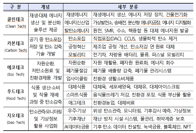 기후테크는 기후(Climate)와 기술(Technology)의 합성어다. 유엔 기후변화협약에 따르면 ‘온실가스 감축’과 ‘기후변화 대응’에 기여하는 혁신 기술을 의미하며, ‘2050 탄소중립녹색성장위원회’는 이를 △클린테크, △카본테크, △에코테크, △푸드테크, △지오테크의 5개 분야로 나누어 개념화했다.
