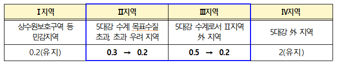 그동안 공공하수처리시설 방류수 수질기준은 전국을 수질관리 중요도에 따라 Ⅰ~Ⅳ (Ⅰ지역(상수원 보호구역 등), Ⅱ지역(5대강 수계 목표수질 초과, 초과 우려 지역), Ⅲ지역(5대강 수계로서 Ⅰ, Ⅱ지역을 제외한 지역), Ⅳ지역(5대강 外 지역))지역으로 나누고, 상수원보호구역 등 수질관리 중요성이 특히 높은 곳은 Ⅰ지역, 5대강 수계는 Ⅱ․Ⅲ지역으로 구분하여 서로 다른 수질을 적용했다.