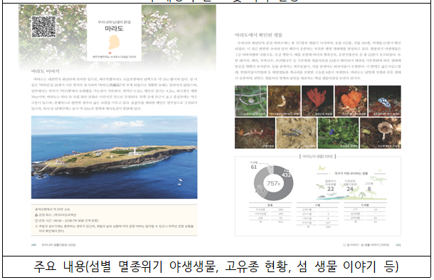 멸종위기 야생생물이 많이 서식하는 섬은 △흑산도(44종), △소청도(37종), △백령도(36종) 순이며, 고유종이 풍부한 섬은 △울릉도(75종), △남해도(66종), △진도(47종) 순으로 나타났다.