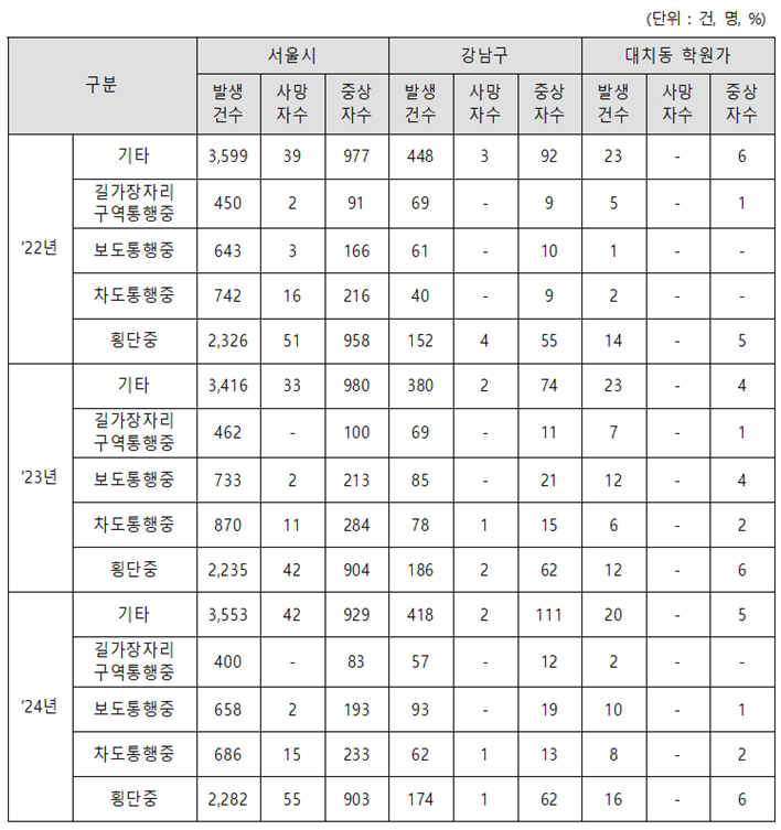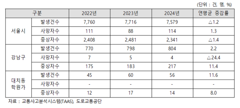 서울특별시의회 윤영희 의원(국민의힘, 비례)이 제안하고 서울시 재정분석담당관이 분석한 자료에 따르면, 최근 3년간(2022~2024년) 서울시 전체 보행자 교통사고 발생 건수는 연평균 1.2% 감소한 반면, 대치동 학원가 일대 보행자 사고는 2022년 45건에서 2024년 56건으로 늘어나는 등 연평균 11.6% 증가해 뚜렷한 대비를 보였다.