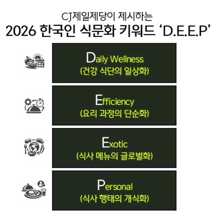 CJ제일제당은 이 조사 결과를 토대로 도출한 식문화 키워드 ‘딥(D.E.E.P)’에 집중해 올해 ‘일상건강·효율·글로벌·개인’에 중점을 둔 제품군 확대에 나선다는 계획이다.