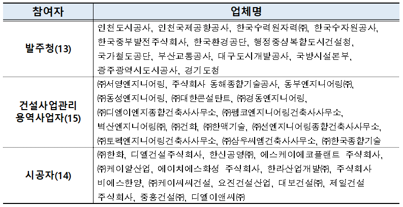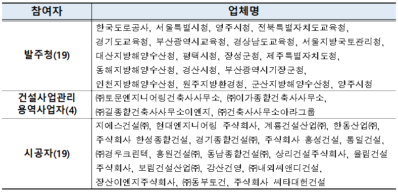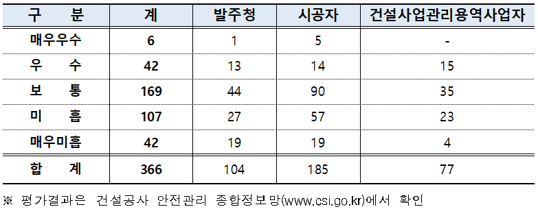 올해 평가대상은 283개 현장의 366개 참여자였으며, 1개 발주청과 5개의 시공자가 “매우 우수” 평가를 받았다. 또한 42개 참여자는 “우수”, 42개 참여자는 “매우 미흡” 한 것으로 평가를 받았다.
