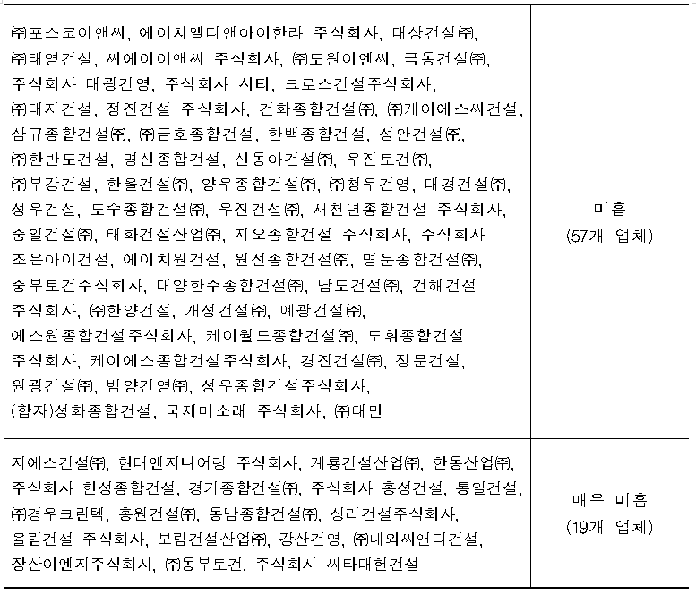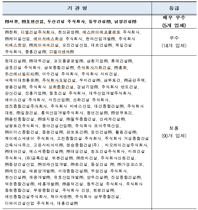 시공자 중에서는 현대엔지니어링 주식회사가 ‘24년 매우 높은 평가점수에도 불구하고 1명의 사망사고로 인해 “우수” 평가 받았고, ’25년에는 다수의 사망자가 발생하는 사고로 인해 “매우 미흡” 평가를 받는데 그쳤다.