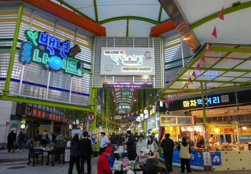 중소벤처기업부의 문화관광형시장 육성사업에 참여 중인 백년시장은 1년 차 사업으로 야시장 운영을 중심으로 한 특화 프로그램을 추진했다. 네온사인과 미러볼, 모바일 DJ부스 등을 활용한 레트로 콘셉트의 공간 조성과 야시장 메뉴 개발 콘테스트 등을 통해 시장 방문 유도와 경쟁력 제고에 나섰다.