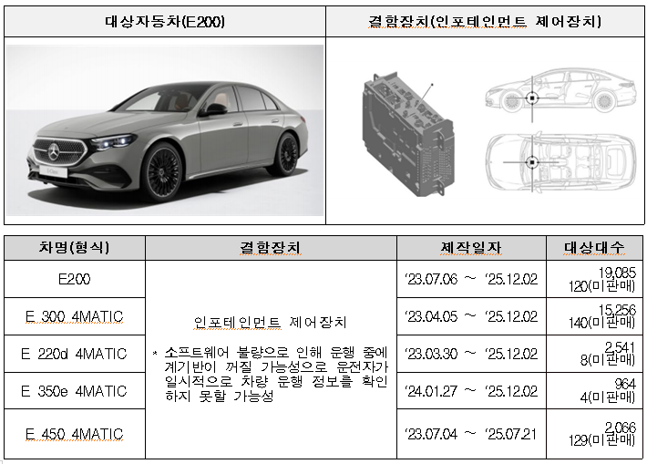 벤츠 E200 등 24개 차종 56,208대는 인포테인멘트 제어장치 소프트웨어 오류로 인해 운행중 계기판이 꺼질 가능성으로 1월 12일부터 시정조치를 진행하고 있다.