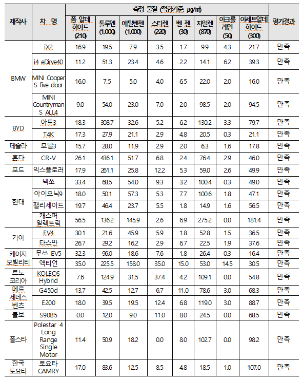 조사 결과, 현대·기아·비엠더블유·벤츠·테슬라·토요타 등 국내외 주요 브랜드를 포함한 23개 전 차종이 8개 유해물질 권고기준을 모두 만족한 것으로 나타났다.