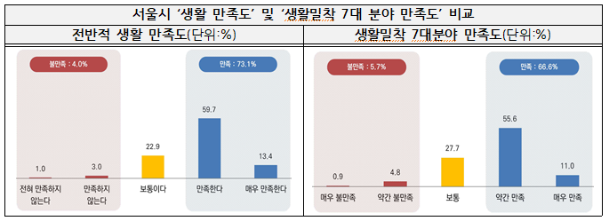 조사 결과, 서울시 전반적인 생활에 대한 만족도는 응답자의 73.1%가 ‘만족한다’ 고 응답하였으나, 생활밀착 7대 분야에 대한 만족도 결과에서는 응답자 중 66.6%가 만족하고 있는 것으로 나타나, 생활밀착 분야에서의 개선 필요성이 있는 것으로 조사되었다.