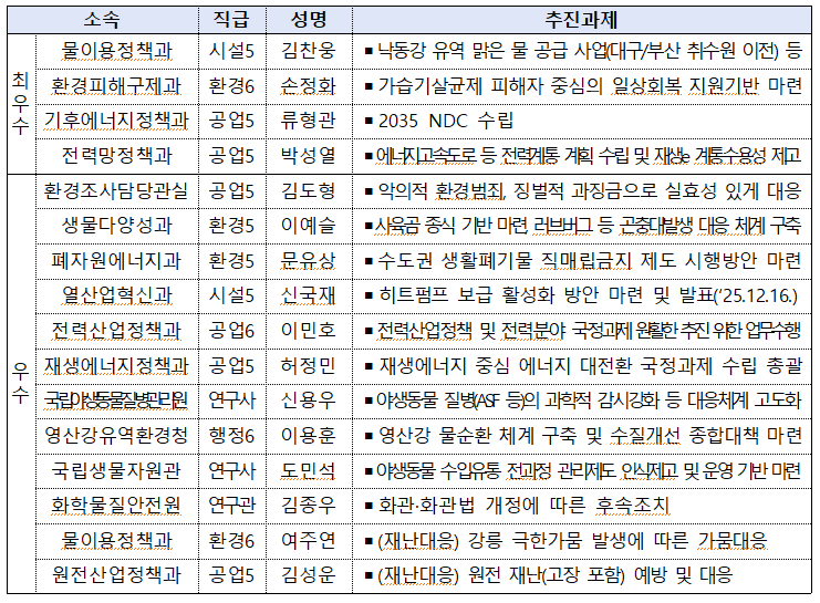 기후부, 2025년 성과우수 직원 16명(최우수 4명 포함) 및 4개 우수부서 선정낙동강 유역 물공급 실현 가능 대안, 가습기살균제 피해자 지원, 에너지고속도로 등 민생 정책 해결
