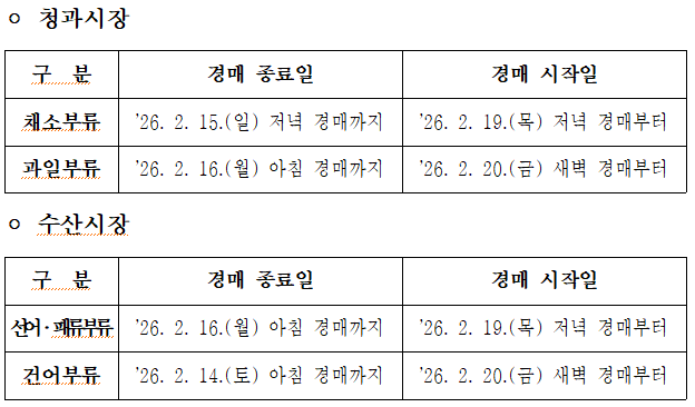 시장도매인제의 경우 ’26. 2. 15.(일) 18시까지 진행하고, ’26. 2. 19.(목) 18시부터 다시 거래가 진행된다. 양곡도매시장은 ’26. 2. 14.(토) 18시까지 거래가 이뤄지고 ’26. 2. 19.(목) 07시부터 거래를 재개할 예정이다.