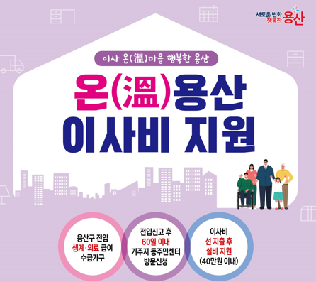 지원 대상은 용산구로 전입(관내 전입 포함)한 국민기초생활보장 생계·의료급여 수급가구로, 이사비를 선지출한 뒤 신청하면 가구당 최대 40만 원 범위 내에서 실제 소요된 이사비용을 지원받을 수 있다.