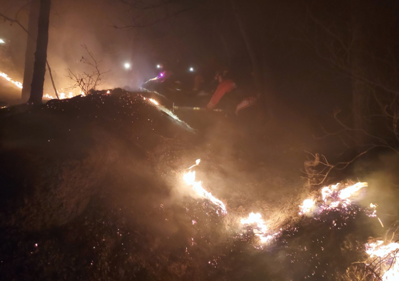 산림당국은 산불진화를 위한 헬기 7대(산림청4, 소방청3), 진화차량 56대(산불진화·지휘차 9, 소방차 39, 기타 8), 진화인력 333명(산불특수진화대 등 52, 산림공무원 18, 소방 113, 경찰 150)을 투입해 산불 진화에 집중하고 있으며, 현장에는 북북서풍의 바람이 평균풍속 0.1㎧로 불고 있다.