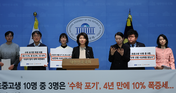 강 의원은 이날 기자회견에서 “정부의 2026년 교육부 업무계획이 AI 중심 정책에만 치우쳐 다수 학생이 수학에서 소외되고 있다”며 “초등 단계의 기초학력 보장부터 수포자 예방 종합대책을 마련해야 한다”고 촉구했다.