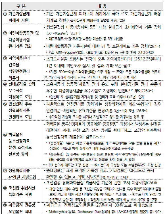 지난해 기후에너지환경부는 가습기살균제 참사피해의 온전한 회복을 위해 국가 주도 배상체계로의 전환방안을 마련( ‘가습기살균제 참사 피해자 종합지원대책’ 확정(제8회 국가정책조정회의, ‘25.12.24) )했고, 인체와 환경 위해성이 높은 고독성 화학물질을 퇴출하기 위해 제한물질 2종을 신규 지정(납화합물(페인트 용도 사용금지), 염화메틸렌(가정용세정제, 페인트제거제 용도 사용금지) )했다.