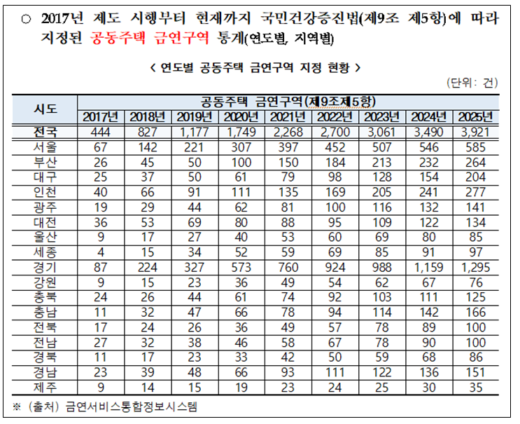 이처럼 금연구역 지정이 확대되고 있음에도 불구하고, 공동주택 내 간접흡연 민원이 지속적으로 증가하면서 ‘금연아파트’ 제도의 실효성에 대한 문제가 제기되고 있다. 특히 지상주차장이나 필로티 구조 공간 등 현행 금연구역 지정 대상에서 제외된 공간에서의 무분별한 흡연으로 입주민들이 간접흡연 피해에 노출되고 있어, 공동주택 내 금연구역 지정 범위를 확대할 필요가 있다는 지적이다.