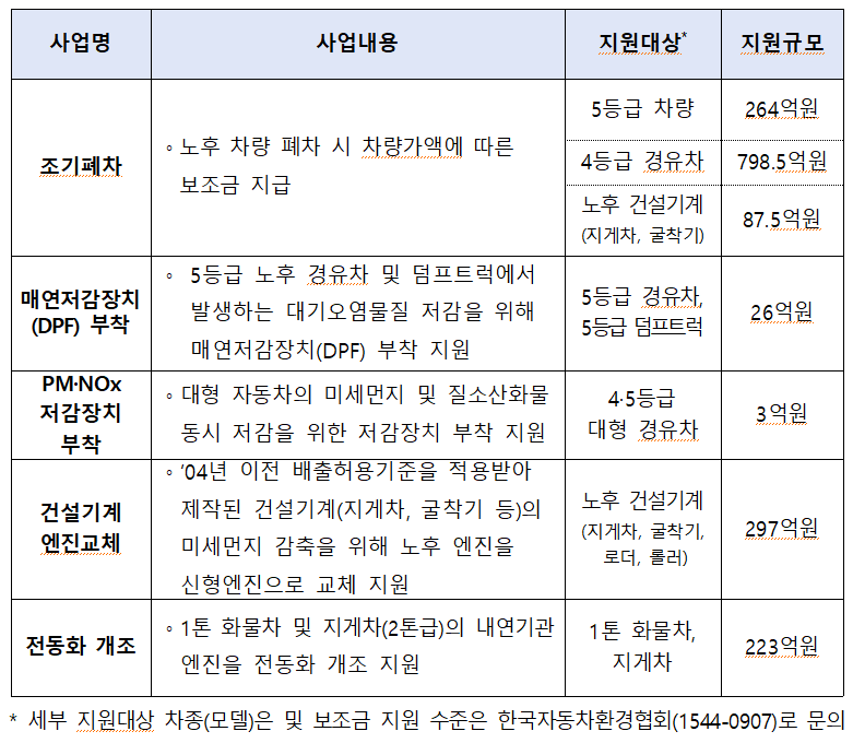 2026년 지원사업에는 조기폐차, 매연저감장치(DPF) 부착, 전동화 개조, 건설기계 엔진교체 등이 포함된다. 올해 조기폐차 지원 규모는 총 11만 3천대이며, 배출가스 5등급 차량 4만 4천대, 4등급 차량 6만 4천대, 지게차·굴착기 5천대로 구성됐다. 올해 사업의 주요 개편 내용은 다음과 같다.