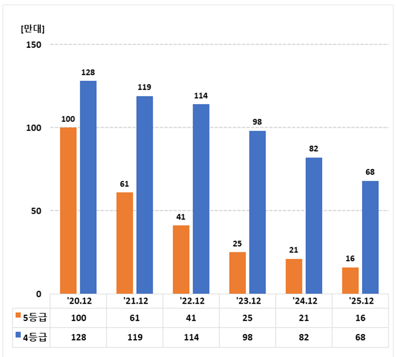 그간 5등급 차량 조기폐차 지원과 운행제한 정책을 병행한 결과, 5등급 차량 등록 대수(자동차 보험가입 기준)는 2020년 말 100만 대에서 지난해 말 16만대로 최근 5년간 84% 감소했다.