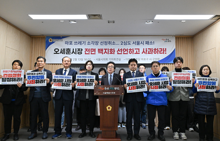 서울시의회 김기덕 의원(마포4, 더불어민주당)을 비롯한 더불어민주당 마포구 시,구의원 일동은 13일 오후 4시 서울시의회 의원회관 기자회견실에서 지난 12일 법원의 2심 판결인 △마포 소각장 선정 취소 및 △서울시 패소 판결을 선포하고, 오 시장의 전면 백지화 선언 및 사과 촉구에 대한 긴급 기자회견을 개최했다.