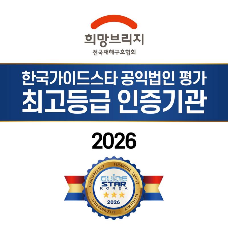 희망브리지 전국재해구호협회(회장 임채청)는 한국가이드스타(이사장 최중경)의 ‘2026년 공익법인 평가’에서 만점인 최고등급 별 3개를 획득했다고 13일 밝혔다.