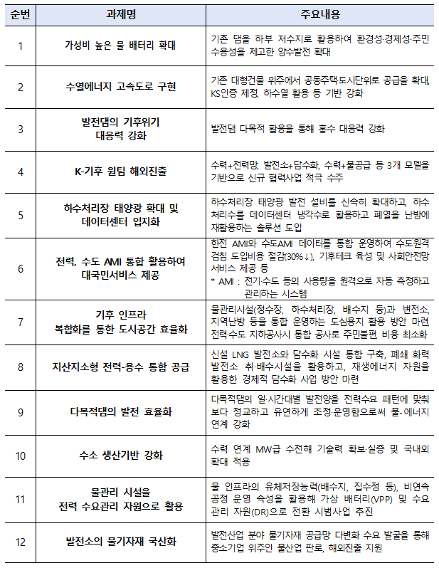 이외에도 하수처리장 태양광 확대 및 데이터센터 입지화, 전력·수도 계량기 통합 활용을 통한 안전서비스 제공 등 산업과 국민 생활에 직결되는 과제도 포함됐다.