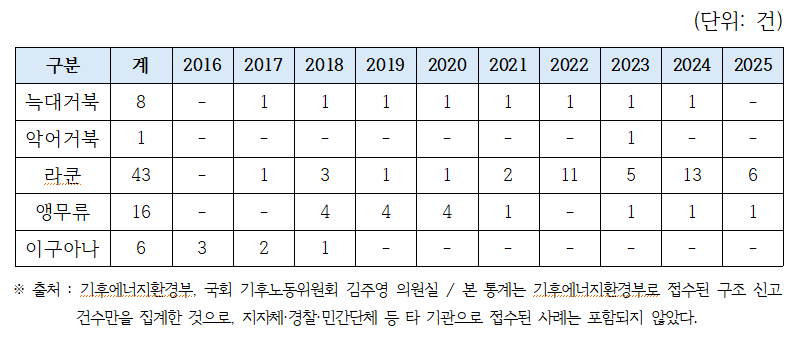 기후에너지환경부 자료를 살펴보면 국제적 멸종위기종 구조 신고도 지속적으로 발생하고 있는 것으로 나타났다. 2022년 이전까지 구조 신고는 총 32건이었으며, 2022년부터 2025년까지는 42건이 접수됐다. 구조 신고 대상은 라쿤이 가장 많았고, 앵무류와 거북류 순으로 나타났다.