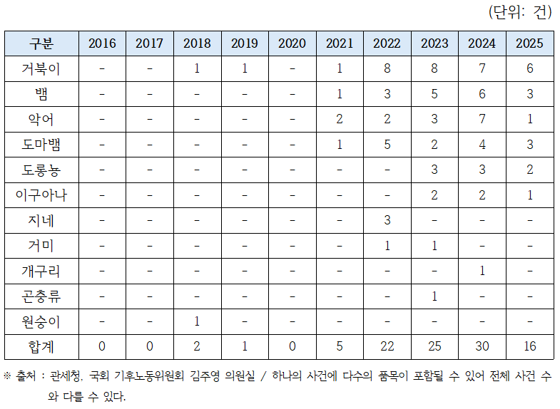 관세청 자료에 따르면 최근 10년간 국제적 멸종위기종 밀반입 단속은 2016년~2021년, 즉 6년간 5건에 그친 반면, 2022년부터 2025년까지 51건이 적발되며 단기간에 약 10배 이상 급증한 것으로 확인됐다고 최근 공시를 통해 밝혔다.
