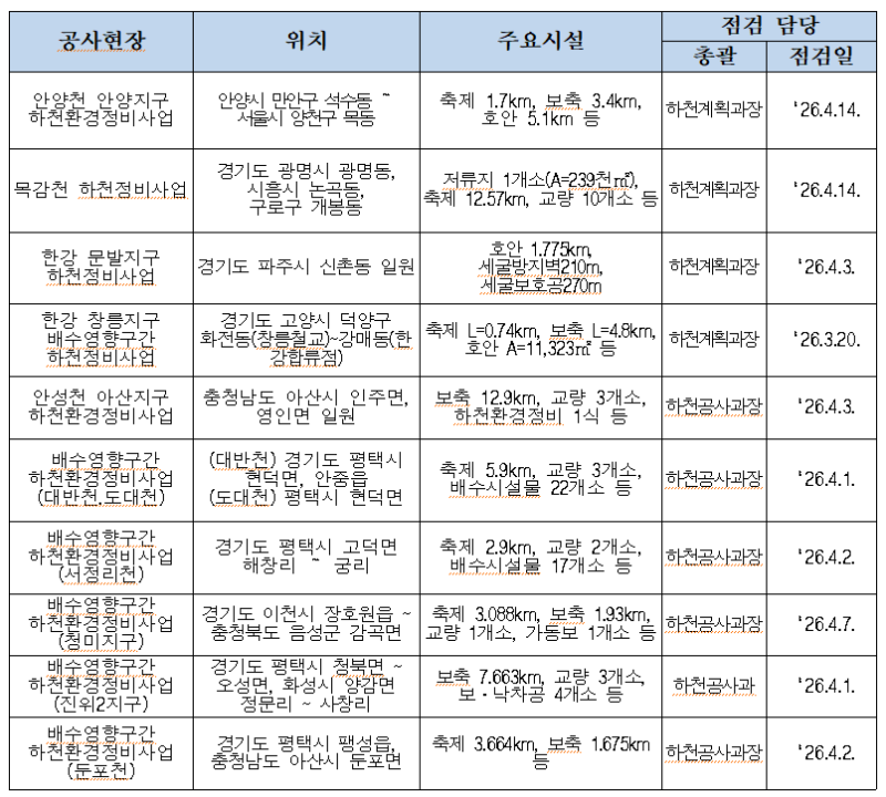점검 대상은 수도권 하천공사현장과 하천시설물 17개소로, 토공 구간 유실․침하, 교량․배수구조물의 균열 및 침하, 전도 여부 등의 안전관리 실태로, 일부 공사현장은 국토안전관리원과 합동 점검을 하였다.