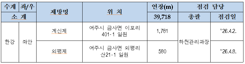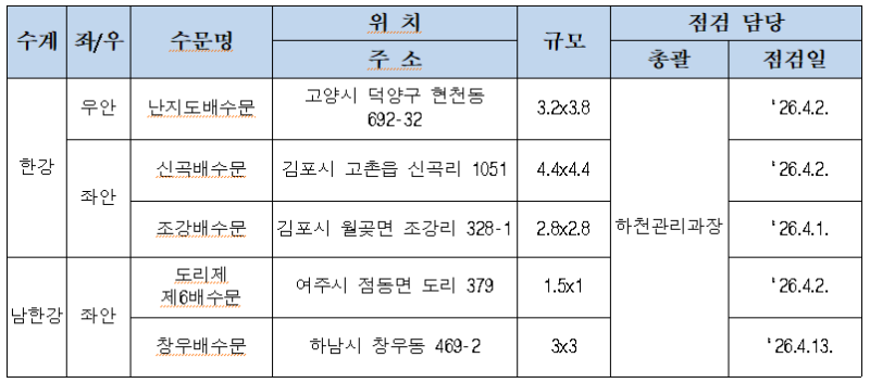 박지영 한강유역환경청 하천국장은“이번 해빙기 안전점검을 통해 하천공사현장과 시설물의 위험요인을 사전에 제거하였다”며, “홍수기에도 지속적으로 안전점검을 실시하여 지역 주민과 공사현장 노동자의 안전확보에 철저히 대비하겠다.”고 말했다.